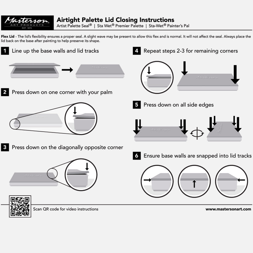 No more wasted paint! The Sta-Wet palette system was developed by Masterson over 25 years ago and is unmatched in its level of functionality. Masterson’s Sta-Wet system keeps acrylics and other water-based paints moist on the open palette for hours. Once the lid is closed, the paints will stay in workable condition for days, even weeks. A wet sponge and special permeable palette paper provide the paint with a constant source of moisture. Your paints will not dry out.